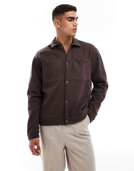 ASOS DESIGN - Premium oversized jack van 400gsms zware jersey met knopen en zakje in bruin