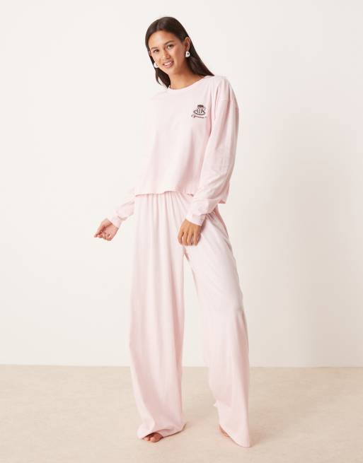 ASOS DESIGN - Pyjamaset met lange mouwen, wijde pijpen en espresso-borduursel in lichtroze