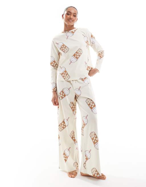 ASOS DESIGN - Pyjamaset met top met lange mouwen en broek met print van ijskoffie in beige