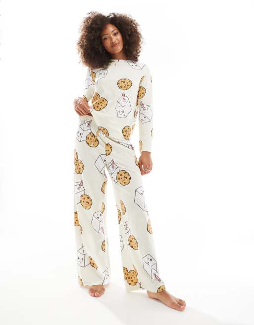 ASOS DESIGN - Pyjamaset van top met lange mouwen en broek met print van koekjes en melk in crème