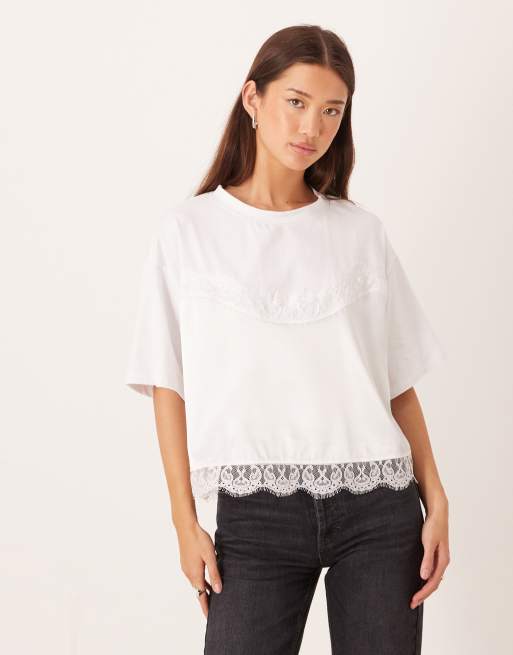 ASOS DESIGN - Recht cropped T-shirt met kanten laagdetail in wit