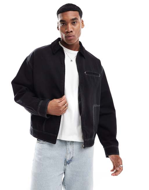 ASOS DESIGN - Recht oversized Harrington jack met kraagje van corduroy en contrasterende stiksels in zwart