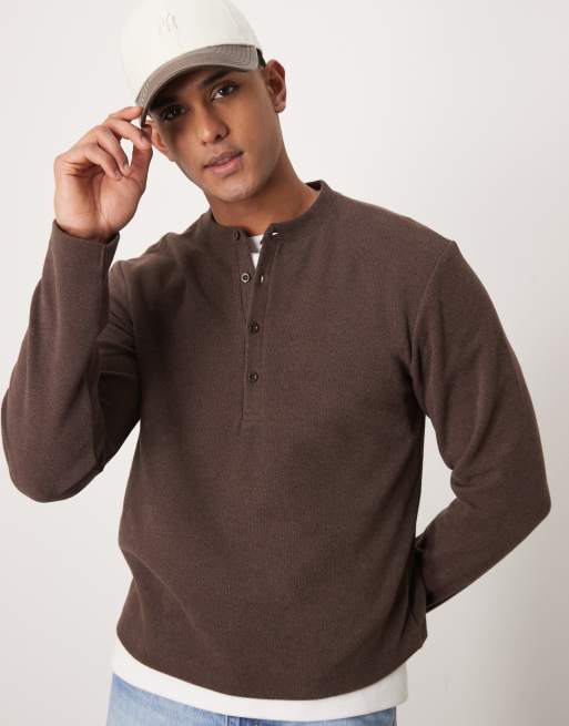 ASOS DESIGN - Rechte geribbelde Henley-trui van zware stof in donkerbruin