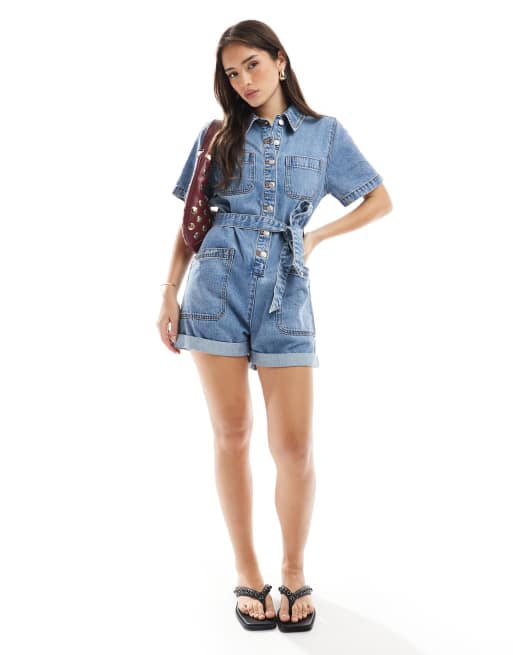 ASOS DESIGN - Rechte playsuit met riem in midwash blauw