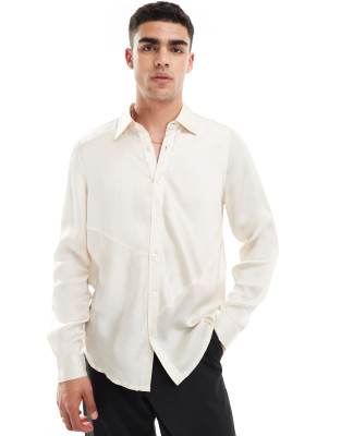 ASOS DESIGN - Regular-fit overhemd van satijn met gekreukte textuur en aan elkaar gestikte vlakken in gebroken wit