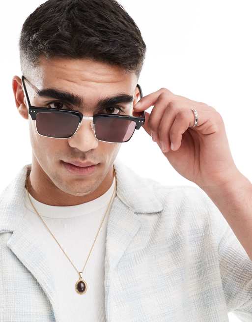 ASOS DESIGN - Retro zonnebril met bordeauxrode glazen en zwart en zilver montuur