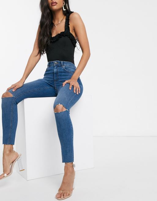 ASOS DESIGN - Ridley - Skinny jeans met hoge taille en scheuren in middenblauw