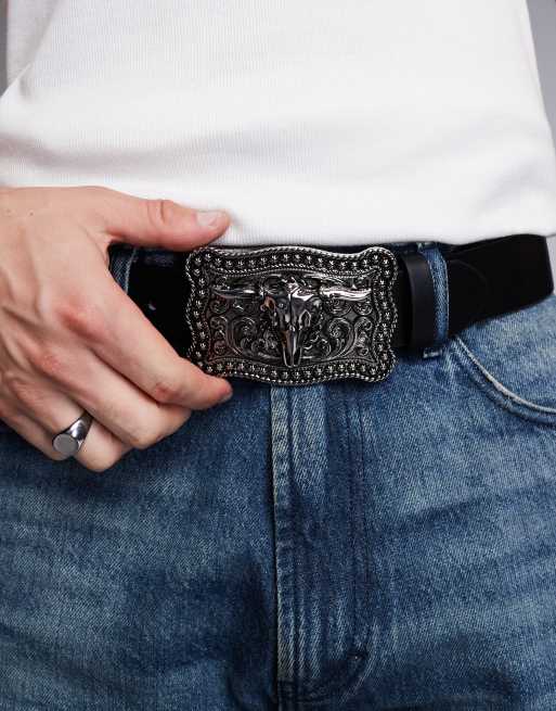 ASOS DESIGN - Riem van imitatieleer met statement zilveren western gesp in zwart