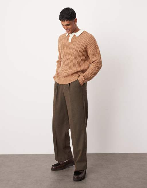 ASOS DESIGN - Ruimvallend kabelgebreid rugbyshirt in lichtbruin