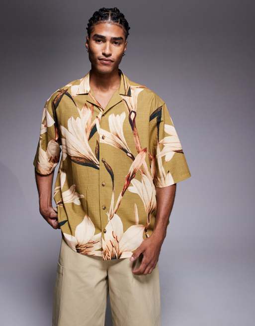 ASOS DESIGN - Ruimvallend overhemd met reverskraag en bloemenprint in kaki