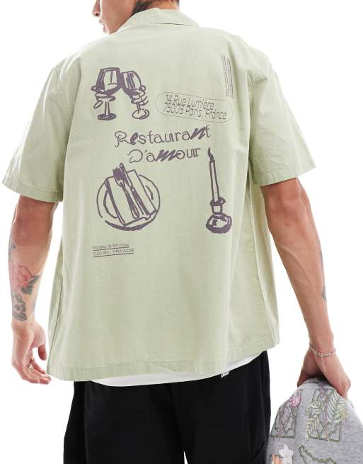 ASOS DESIGN - Ruimvallend overhemd met reverskraag en print op de achterkant in saliegroen