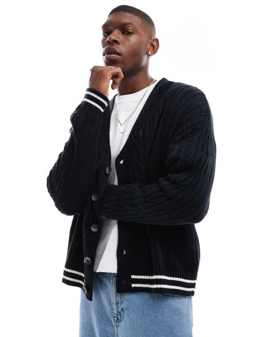 ASOS DESIGN - Ruimvallend recht gebreid vest met kabels in marineblauw met ecrukleurige biezen