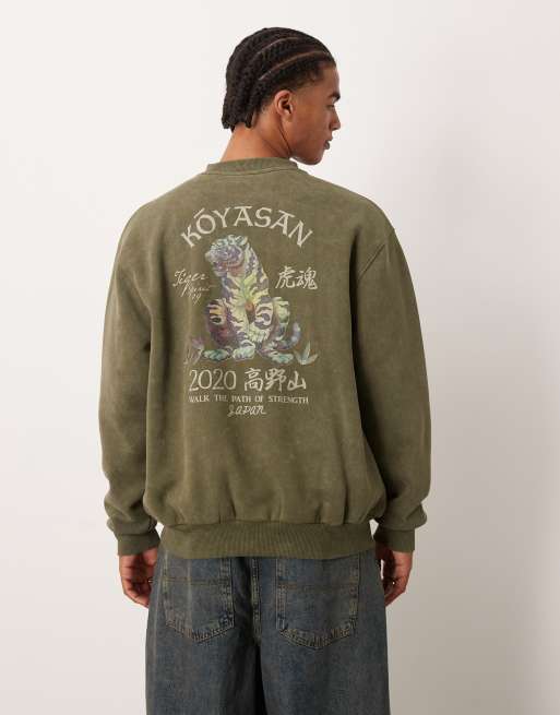 ASOS DESIGN - Ruimvallend sweatshirt met print op de achterkant in kaki met wassing