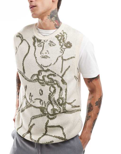 ASOS DESIGN - Ruimvallende gebreide tanktop in ecru met kakigroene lijntekening