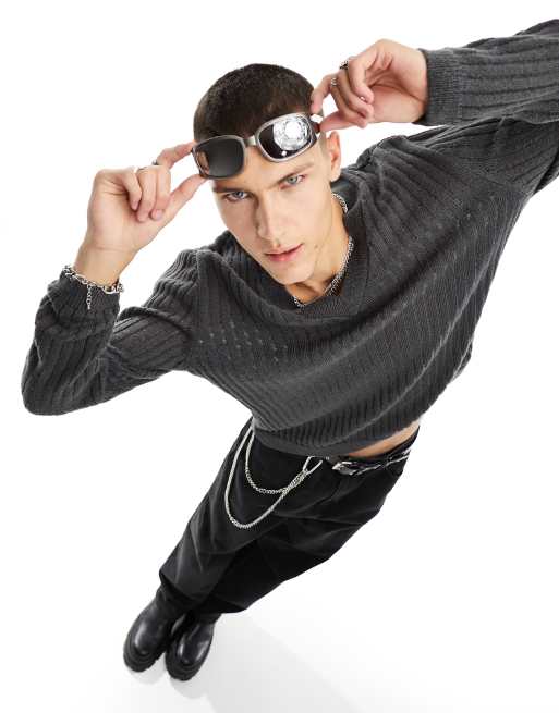 ASOS DESIGN - Ruimvallende gebreide trui met opengewerkt detail in antraciet