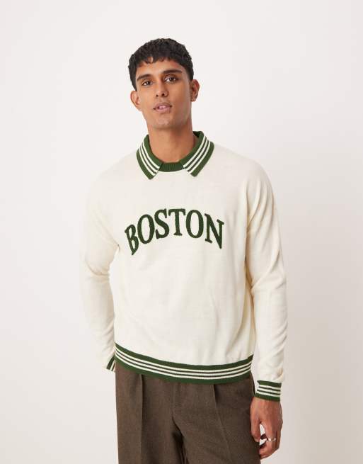 ASOS DESIGN - Ruimvallende gebreide trui met rechte pasvorm, polokraag en varsity tekstprint in crème