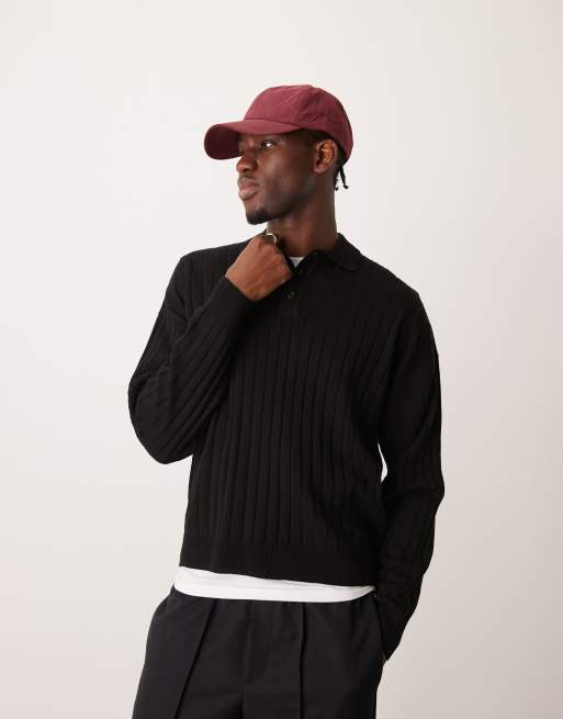 ASOS DESIGN - Ruimvallende geribbelde gebreide polotrui met lange mouwen in zwart