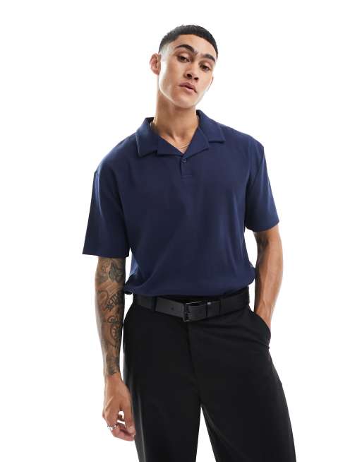 ASOS DESIGN - Ruimvallende geribbelde polo met reverskraag in marineblauw