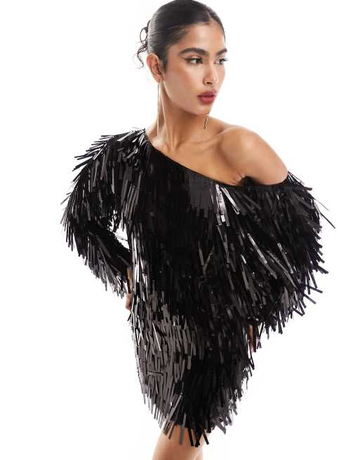 ASOS DESIGN - Ruimvallende mini jurk met blote schouders en rechthoekige lovertjes in zwart