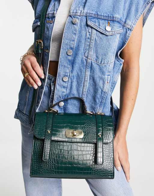 ASOS DESIGN - Satchel tas met draaislot en krokodillenmotief in groen