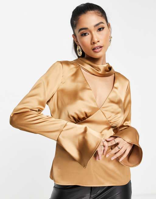 ASOS DESIGN - Satijnen blouse met lange mouwen en detail bij de hals