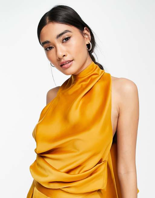 ASOS DESIGN - Satijnen gedrapeerde haltertop in goud, deel van co-ord set