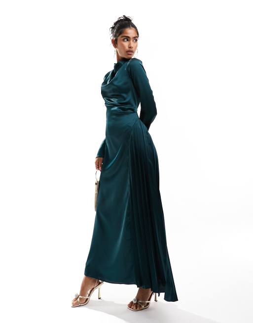 ASOS DESIGN - Satijnen maxi-jurk met geplooid detail in groenblauw
