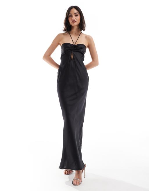 ASOS DESIGN - Satijnen maxi jurk met halternek, gerimpelde buste en uitsnijding in zwart