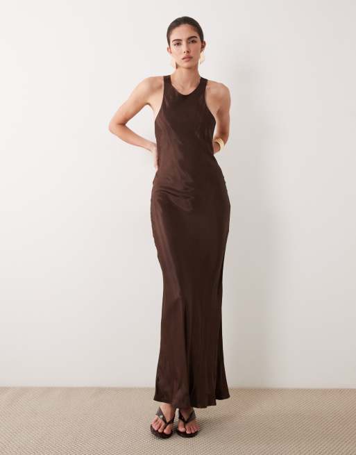 ASOS DESIGN - Satijnen maxi jurk met racerhals en split in chocoladebruin
