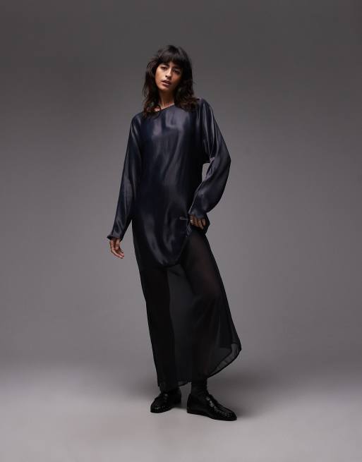 ASOS DESIGN - Satijnen maxi-jurk met rechte hals, vleermuismouwen en kanten rok in marineblauw