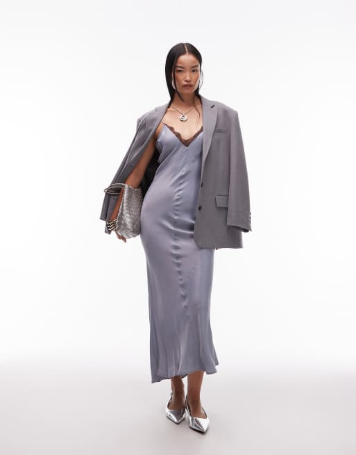 ASOS DESIGN - Satijnen maxi-slipdress met V-hals en kanten rand in lichtblauw