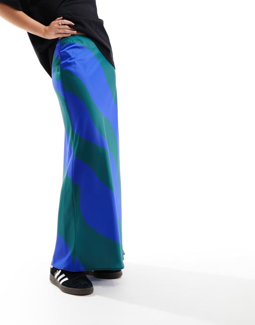 ASOS DESIGN - Satijnen maxirok met schuine randen in groenblauwe grafische print