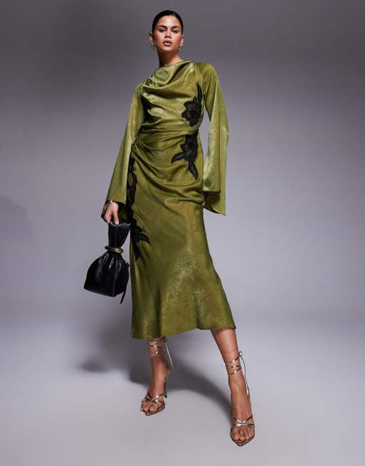 ASOS DESIGN - Satijnen midaxi jurk met rechte hals en appliqué van gebloemd kant in olijfgroen