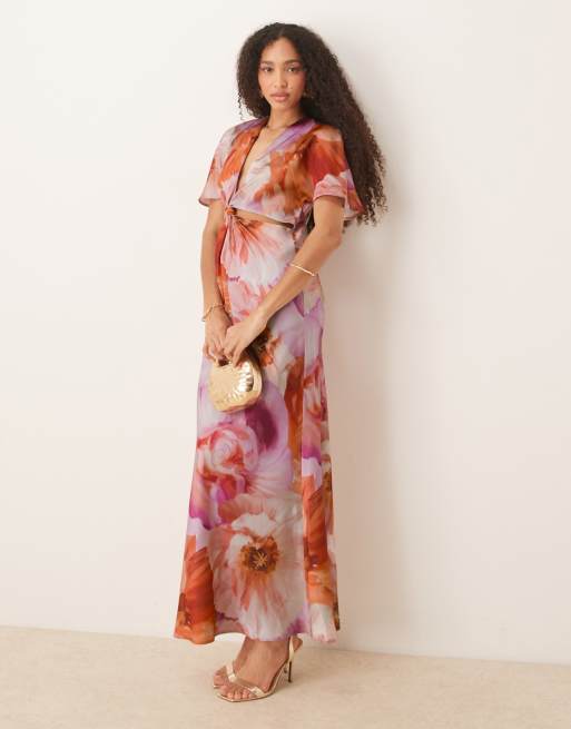 ASOS DESIGN - Satijnen midi jurk met geknoopt detail en uitsnijding in roze en oranje bloemenprint