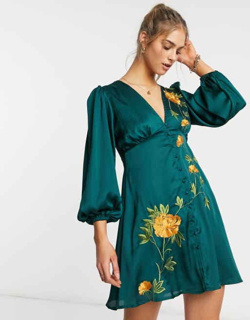 ASOS DESIGN - Satijnen mini-jurk met knopen en borduursel