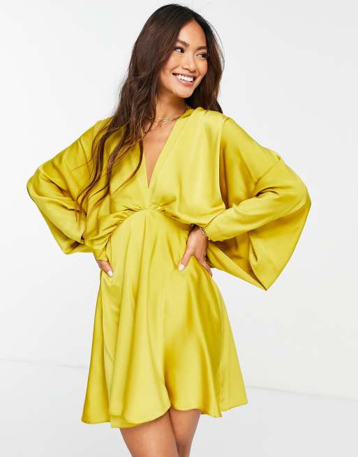 ASOS DESIGN - Satijnen mini jurk met vleermuismouwen, schuine afsnijding en striksluiting op de rug in goud