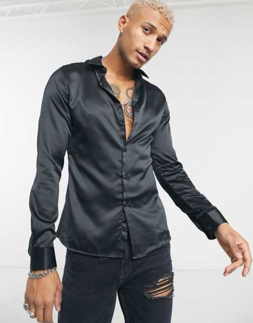 ASOS DESIGN - Satijnen overhemd met normale pasvorm in zwart
