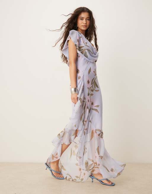 ASOS DESIGN - Schuingesneden midaxi jurk met gedrapeerde halslijn, asymmetrische zoom en bloemenprint in blauw