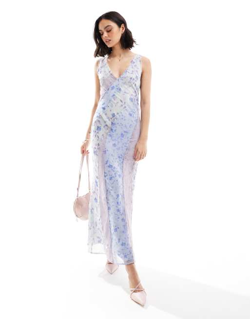 ASOS DESIGN - Schuingesneden midi jurk met V-hals, kanten inzetstukken en gesplitste bloemenprint