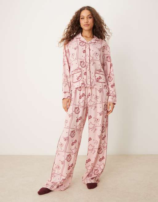 ASOS DESIGN - Set met pyjama-overhemd en broek met wijde pijpen van modal met rodeoprint in roze