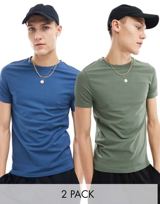ASOS DESIGN - Set van 2 muscle fit T-shirts in donkergroen en blauw