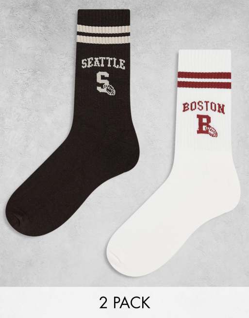 ASOS DESIGN - Set van 2 paar sportsokken met 'Boston'- en 'Seattle' print in ecru en bruin