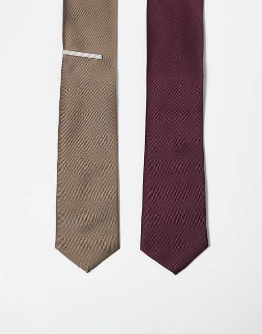 ASOS DESIGN - Set van 2 satijnen stropdassen met dasspeld in bordeauxrood en stone