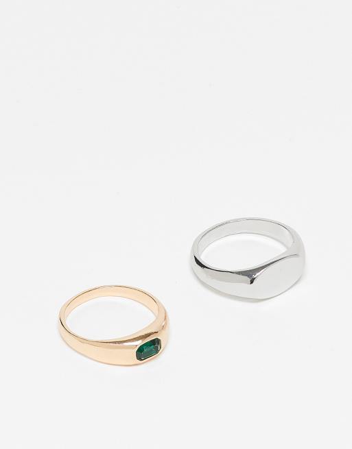 ASOS DESIGN - Set van 2 zegelringen van gemengde metalen met imitatie-smaragdsteentje in multi