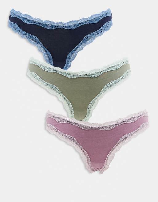 ASOS DESIGN - Set van 3 Braziliaanse slips van katoen en kant met contrasterende randen in blauw, kaki en paars