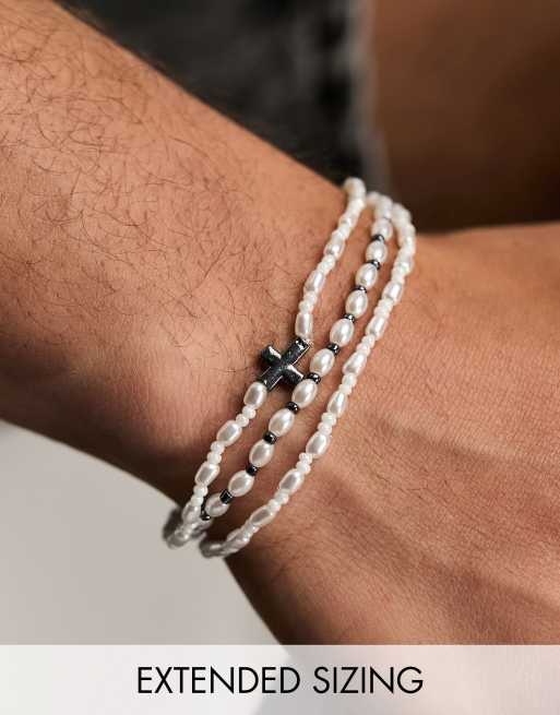 ASOS DESIGN - Set van 3 skinny kralenarmbanden met imitatieparels en kruisje van hematiet