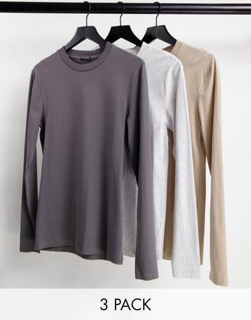 ASOS DESIGN - Set van 3 T-shirts met lange mouwen en muscle fit in grijs, wit en beige