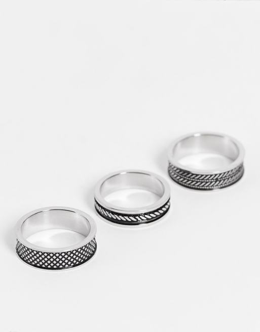 ASOS DESIGN - Set van 3 waterbestendige, roestvrijstalen, brede ringen met details in reliëf in zilver