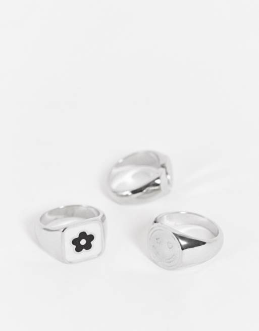 ASOS DESIGN - Set van 3 zegelringen met hart- en bloemmotief in zilverkleur