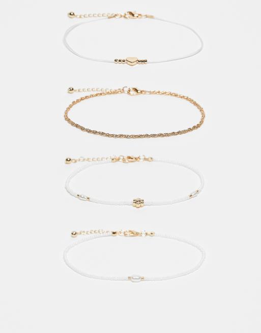 ASOS DESIGN - Set van 4 enkelbandjes met witte kralen, imitatieparels en hartbedel in goudkleur